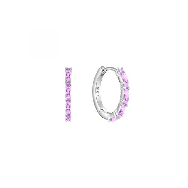 Deze zilverkleurige oorringen van 16 mm zijn verfijnd afgewerkt met lichtroze baguette-geslepen zirkonia’s. De subtiele pasteltoon zorgt voor een romantische touch met een moderne twist.
