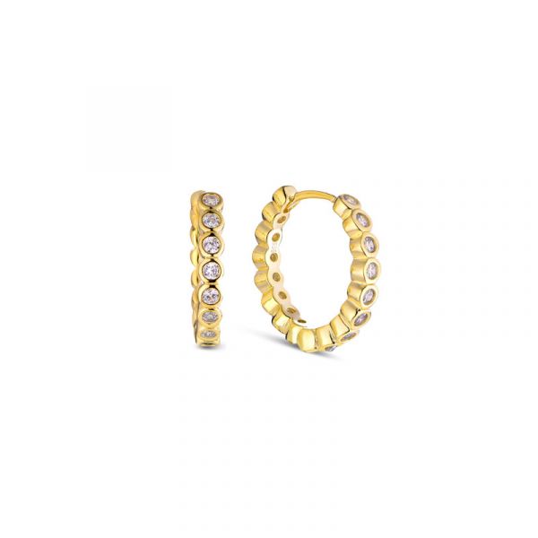 Deze goudkleurige oorringen van 17,5 mm combineren een unieke vormgeving met luxe uitstraling. De rondgezette witte zirkonia’s geven deze oorring een levendig en tegelijkertijd verfijnd karakter – perfect voor dagelijks gebruik of een stijlvolle avondlook.