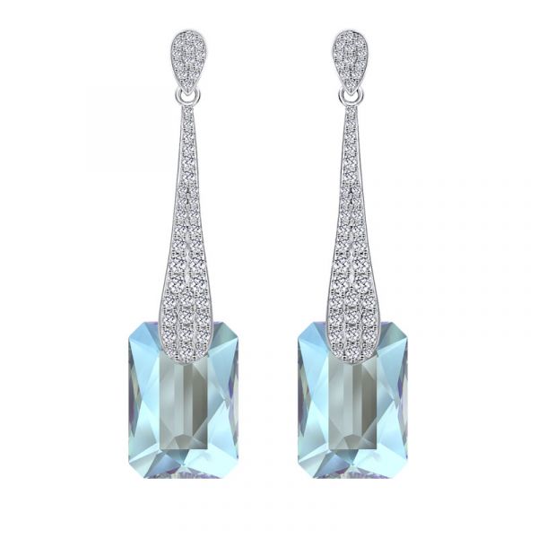 Combineer deze Aquamarine Shimmer kleurige Rettangolo Sphérique oorhangers met de creoli oorbellen om je look helemaal compleet te maken. Deze 16mm rechthoekige oorhangers zijn gemaakt van 925 Sterling zilver en zijn voorzien van een rhodium plating en Aquamarine Shimmer kleurige Brillante kristal. Zie ook de bijpassende hanger in gerelateerde producten.